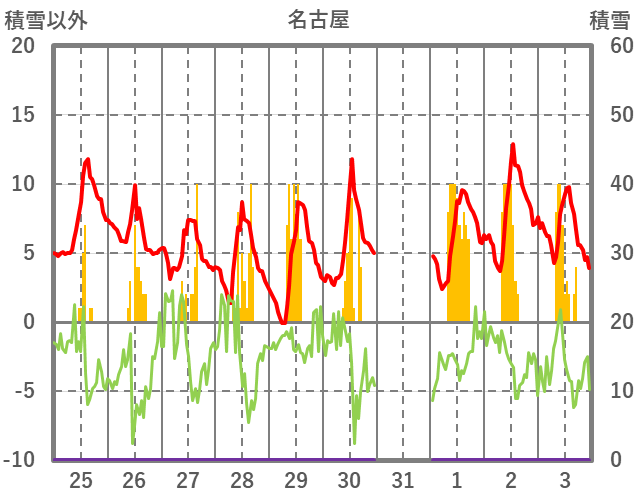| 日 | 時 | 気温 | 降水 | 風向/風速 | 日照 | 積雪 | 降雪 |