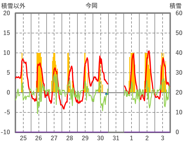 | 日 | 時 | 気温 | 降水 | 風向/風速 | 日照 | 積雪 | 降雪 |