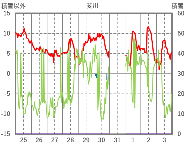 | 日 | 時 | 気温 | 降水 | 風向/風速 | 日照 | 積雪 | 降雪 |