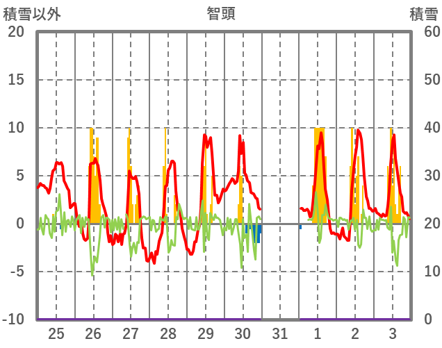 | 日 | 時 | 気温 | 降水 | 風向/風速 | 日照 | 積雪 | 降雪 |