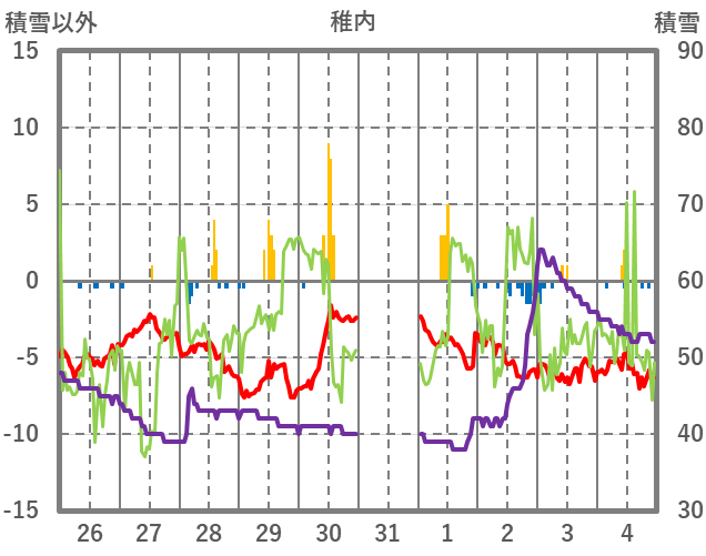 | 日 | 時 | 気温 | 降水 | 風向/風速 | 日照 | 積雪 | 降雪 |