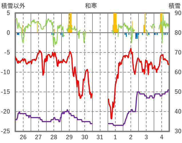| 日 | 時 | 気温 | 降水 | 風向/風速 | 日照 | 積雪 | 降雪 |