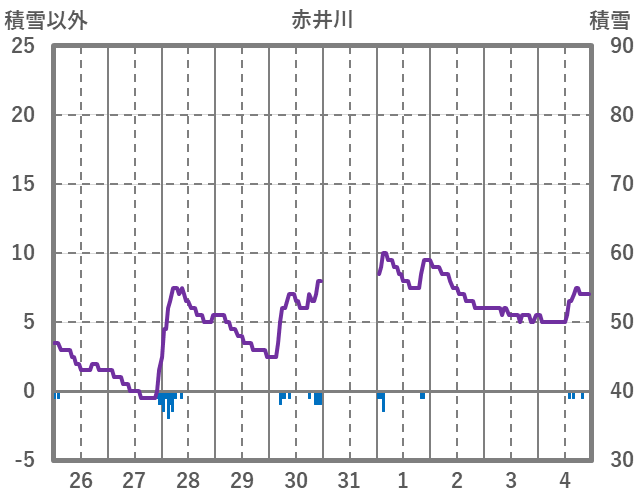 | 日 | 時 | 気温 | 降水 | 風向/風速 | 日照 | 積雪 | 降雪 |