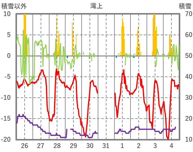 | 日 | 時 | 気温 | 降水 | 風向/風速 | 日照 | 積雪 | 降雪 |