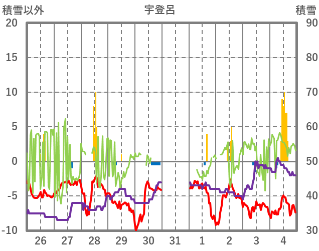 | 日 | 時 | 気温 | 降水 | 風向/風速 | 日照 | 積雪 | 降雪 |