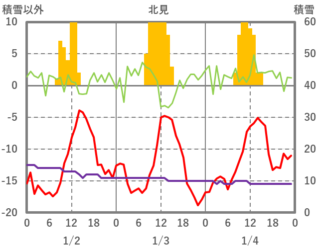 | 日 | 時 | 気温 | 降水 | 風向/風速 | 日照 | 積雪 | 降雪 |