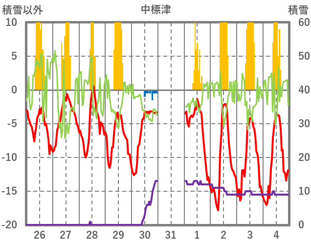 | 日 | 時 | 気温 | 降水 | 風向/風速 | 日照 | 積雪 | 降雪 |