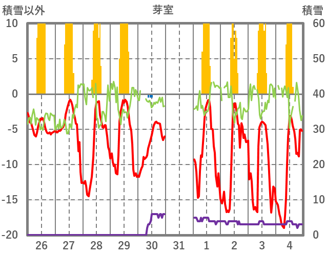 | 日 | 時 | 気温 | 降水 | 風向/風速 | 日照 | 積雪 | 降雪 |