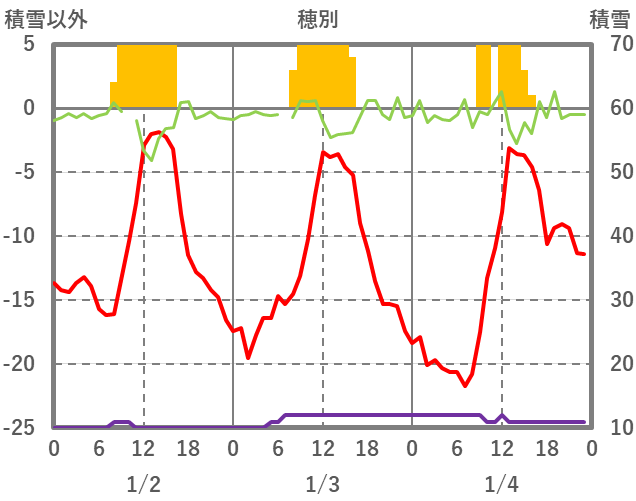 | 日 | 時 | 気温 | 降水 | 風向/風速 | 日照 | 積雪 | 降雪 |
