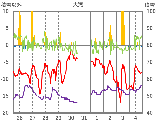 | 日 | 時 | 気温 | 降水 | 風向/風速 | 日照 | 積雪 | 降雪 |