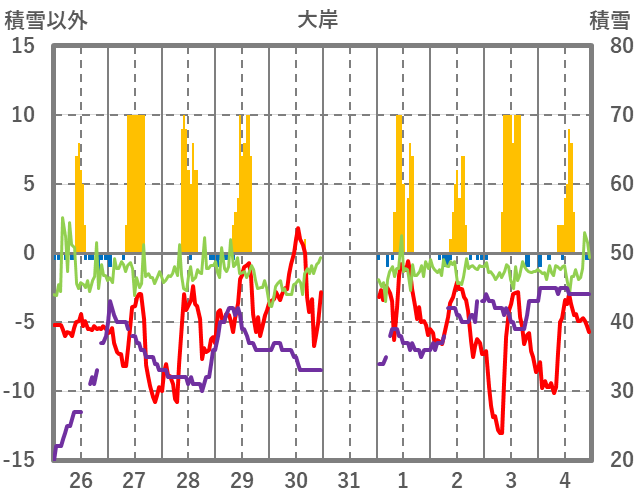 | 日 | 時 | 気温 | 降水 | 風向/風速 | 日照 | 積雪 | 降雪 |