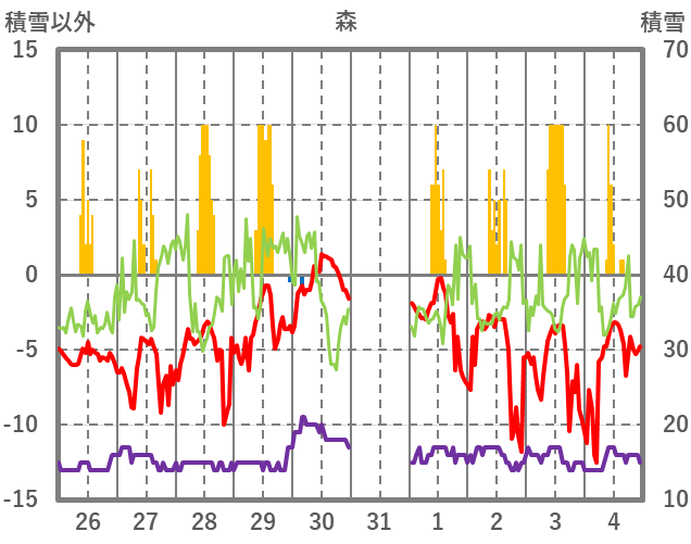 | 日 | 時 | 気温 | 降水 | 風向/風速 | 日照 | 積雪 | 降雪 |