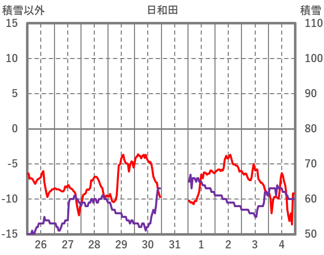 | 日 | 時 | 気温 | 降水 | 風向/風速 | 日照 | 積雪 | 降雪 |
