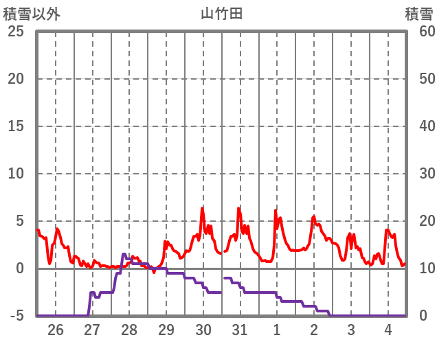 | 日 | 時 | 気温 | 降水 | 風向/風速 | 日照 | 積雪 | 降雪 |