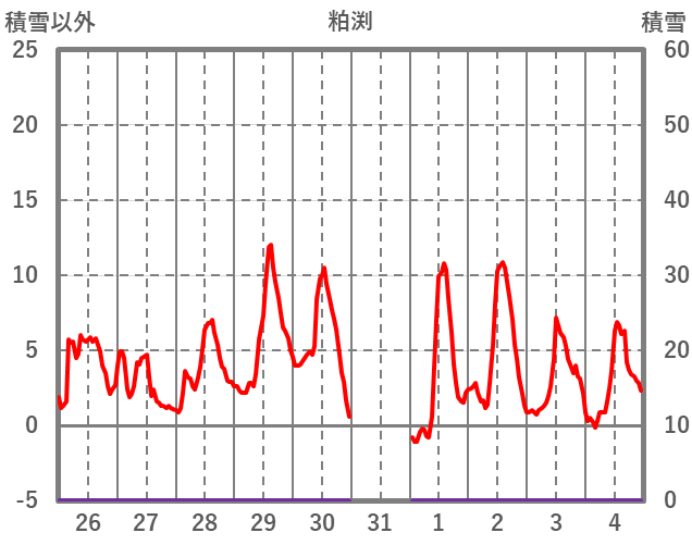 | 日 | 時 | 気温 | 降水 | 風向/風速 | 日照 | 積雪 | 降雪 |