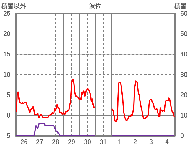 | 日 | 時 | 気温 | 降水 | 風向/風速 | 日照 | 積雪 | 降雪 |