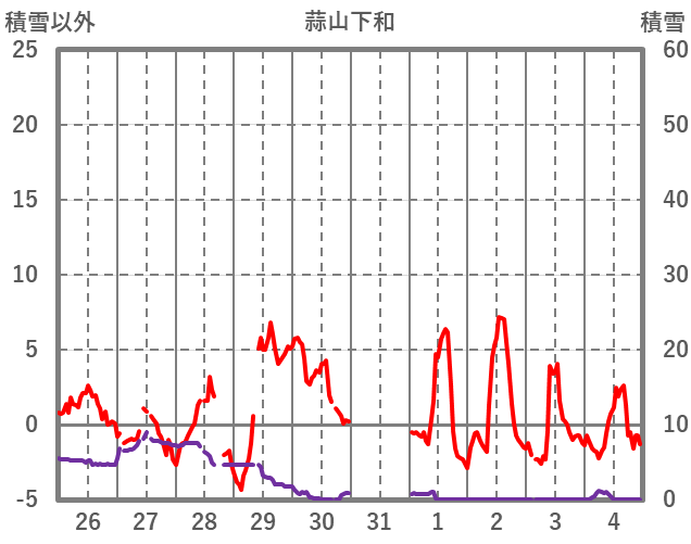 | 日 | 時 | 気温 | 降水 | 風向/風速 | 日照 | 積雪 | 降雪 |