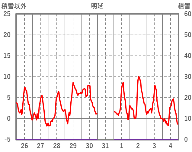 | 日 | 時 | 気温 | 降水 | 風向/風速 | 日照 | 積雪 | 降雪 |