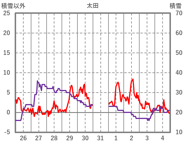 | 日 | 時 | 気温 | 降水 | 風向/風速 | 日照 | 積雪 | 降雪 |