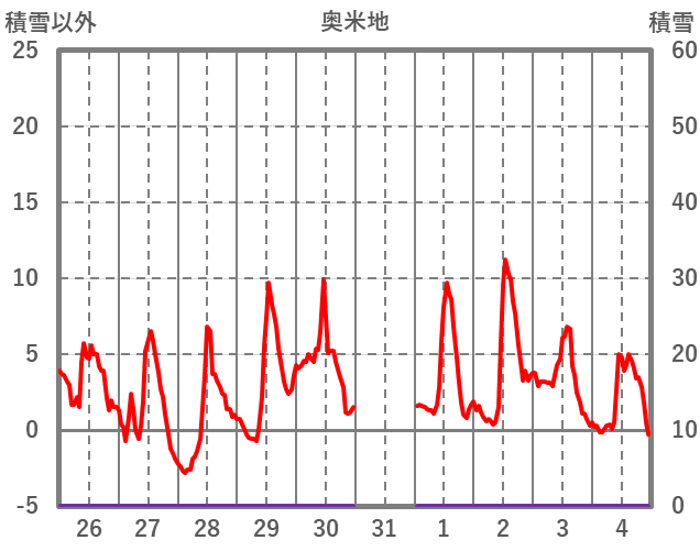 | 日 | 時 | 気温 | 降水 | 風向/風速 | 日照 | 積雪 | 降雪 |