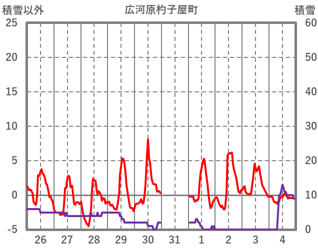 | 日 | 時 | 気温 | 降水 | 風向/風速 | 日照 | 積雪 | 降雪 |