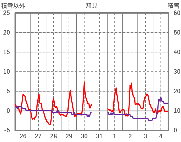 | 日 | 時 | 気温 | 降水 | 風向/風速 | 日照 | 積雪 | 降雪 |