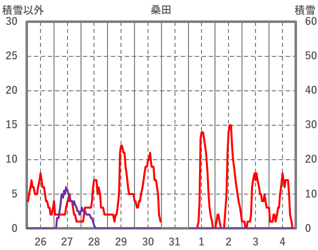 | 日 | 時 | 気温 | 降水 | 風向/風速 | 日照 | 積雪 | 降雪 |