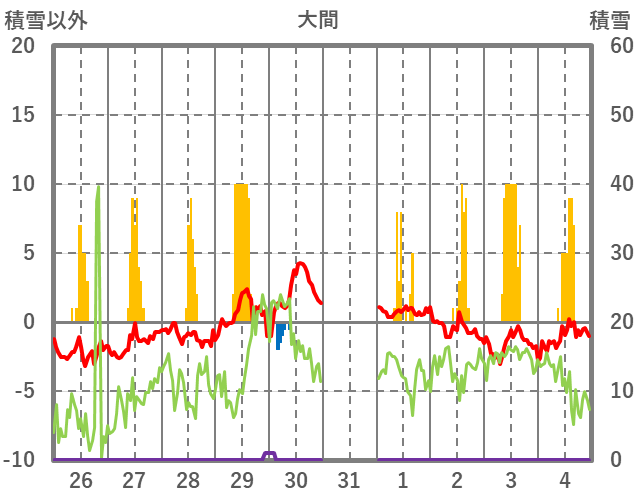 | 日 | 時 | 気温 | 降水 | 風向/風速 | 日照 | 積雪 | 降雪 |