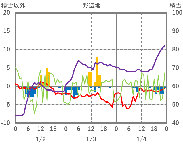 | 日 | 時 | 気温 | 降水 | 風向/風速 | 日照 | 積雪 | 降雪 |