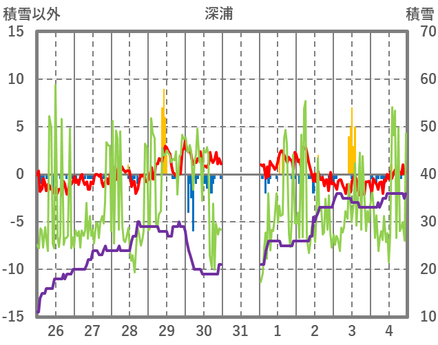 | 日 | 時 | 気温 | 降水 | 風向/風速 | 日照 | 積雪 | 降雪 |