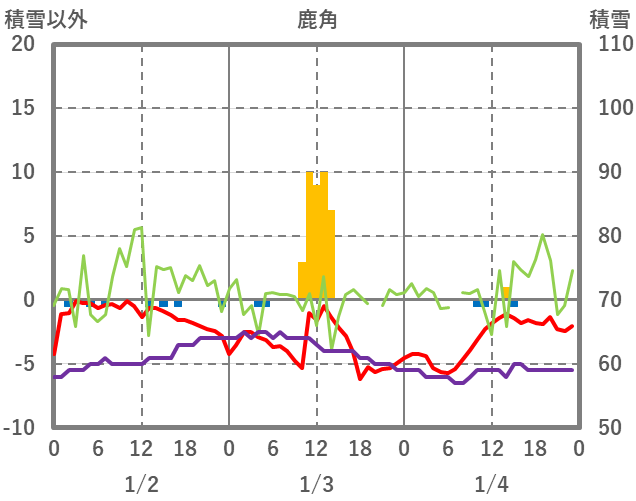 | 日 | 時 | 気温 | 降水 | 風向/風速 | 日照 | 積雪 | 降雪 |
