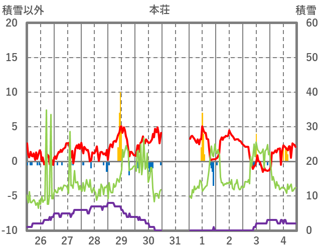 | 日 | 時 | 気温 | 降水 | 風向/風速 | 日照 | 積雪 | 降雪 |