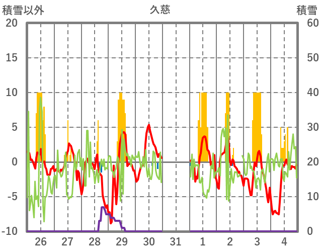 | 日 | 時 | 気温 | 降水 | 風向/風速 | 日照 | 積雪 | 降雪 |