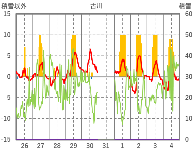 | 日 | 時 | 気温 | 降水 | 風向/風速 | 日照 | 積雪 | 降雪 |