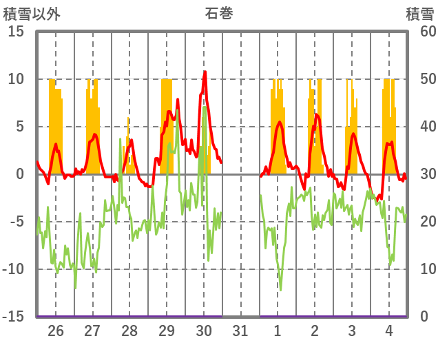 | 日 | 時 | 気温 | 降水 | 風向/風速 | 日照 | 積雪 | 降雪 |