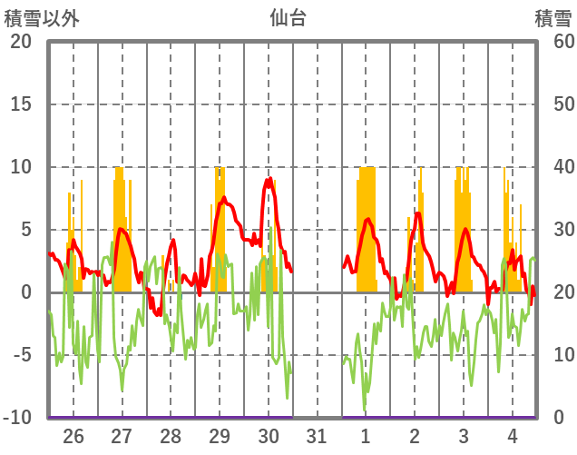 | 日 | 時 | 気温 | 降水 | 風向/風速 | 日照 | 積雪 | 降雪 |