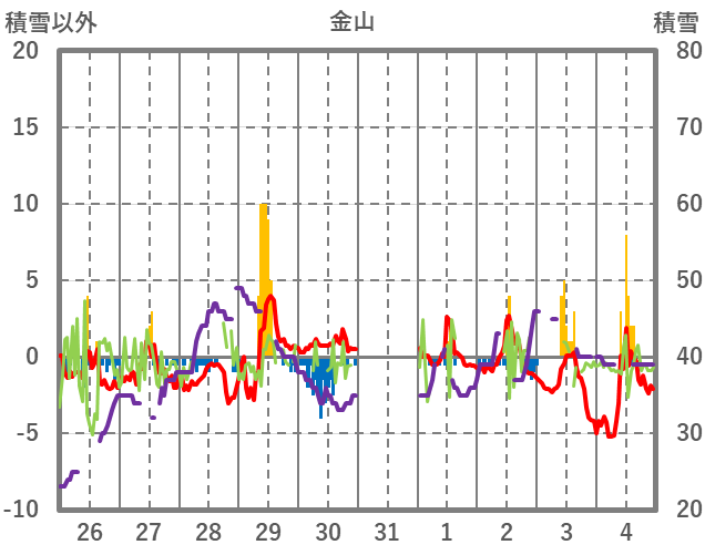 | 日 | 時 | 気温 | 降水 | 風向/風速 | 日照 | 積雪 | 降雪 |