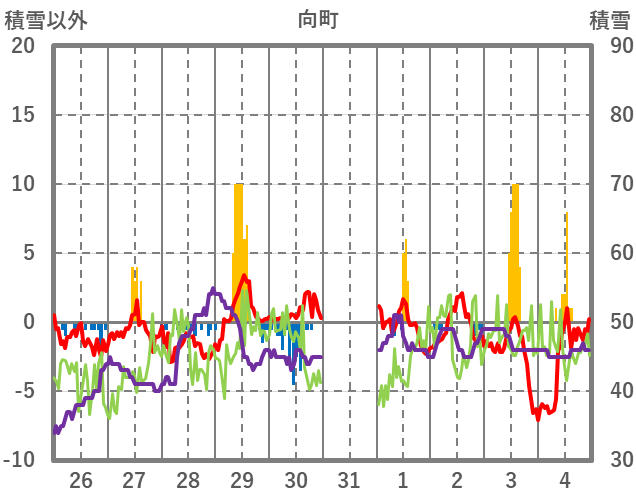 | 日 | 時 | 気温 | 降水 | 風向/風速 | 日照 | 積雪 | 降雪 |
