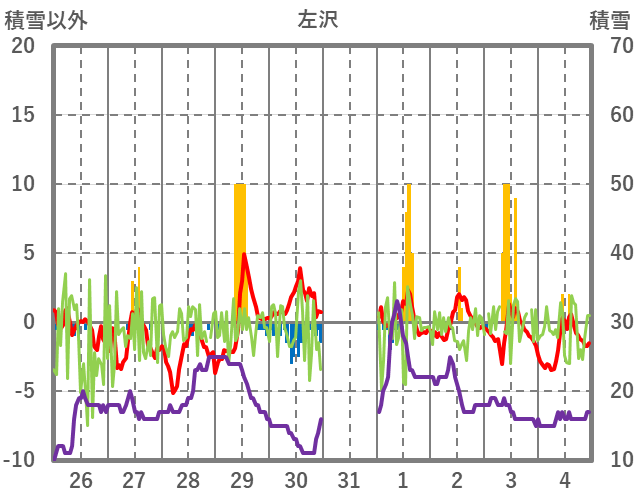 | 日 | 時 | 気温 | 降水 | 風向/風速 | 日照 | 積雪 | 降雪 |