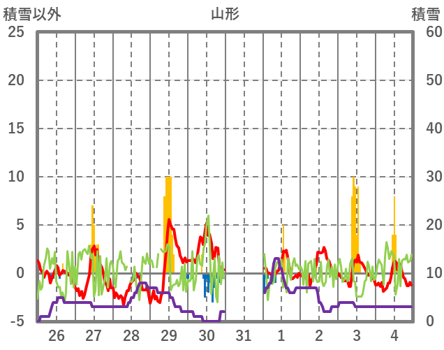 | 日 | 時 | 気温 | 降水 | 風向/風速 | 日照 | 積雪 | 降雪 |