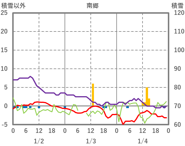 | 日 | 時 | 気温 | 降水 | 風向/風速 | 日照 | 積雪 | 降雪 |