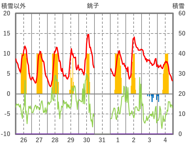 | 日 | 時 | 気温 | 降水 | 風向/風速 | 日照 | 積雪 | 降雪 |
