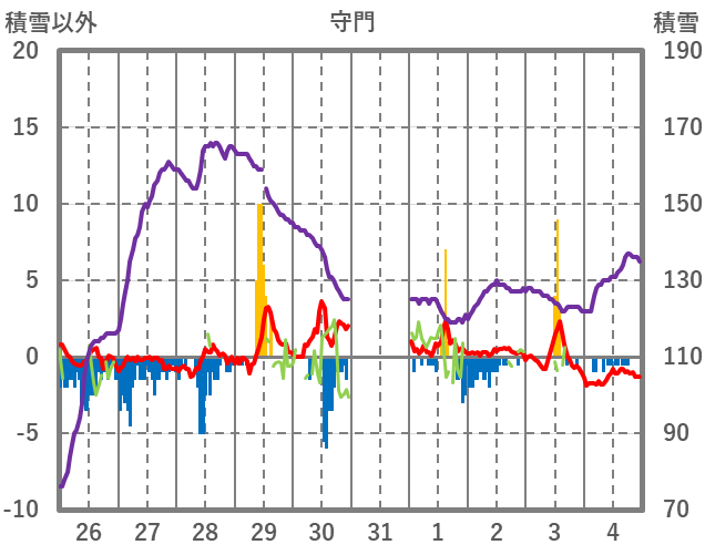 | 日 | 時 | 気温 | 降水 | 風向/風速 | 日照 | 積雪 | 降雪 |