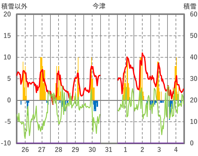 | 日 | 時 | 気温 | 降水 | 風向/風速 | 日照 | 積雪 | 降雪 |