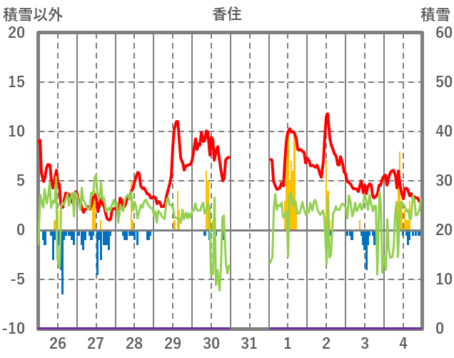 | 日 | 時 | 気温 | 降水 | 風向/風速 | 日照 | 積雪 | 降雪 |