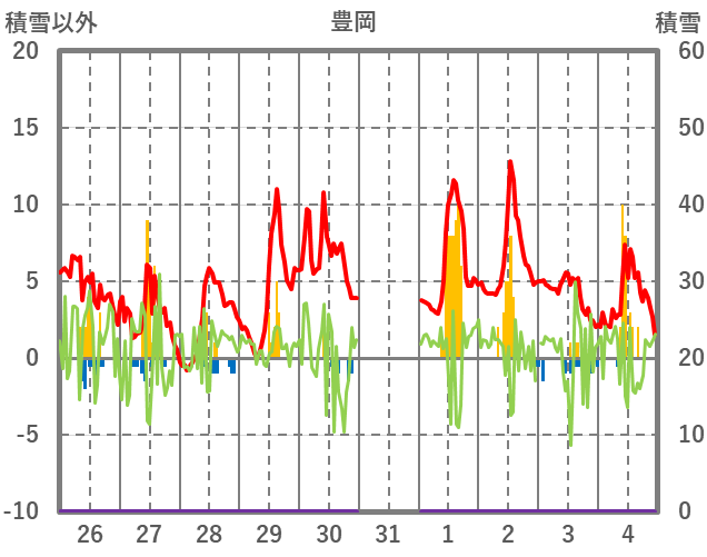 | 日 | 時 | 気温 | 降水 | 風向/風速 | 日照 | 積雪 | 降雪 |