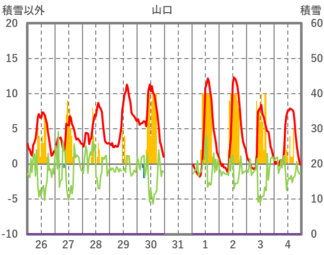 | 日 | 時 | 気温 | 降水 | 風向/風速 | 日照 | 積雪 | 降雪 |