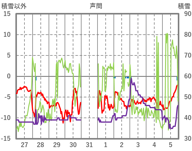 | 日 | 時 | 気温 | 降水 | 風向/風速 | 日照 | 積雪 | 降雪 |