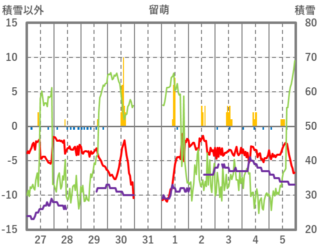 | 日 | 時 | 気温 | 降水 | 風向/風速 | 日照 | 積雪 | 降雪 |