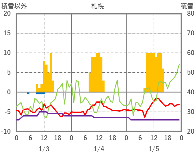 | 日 | 時 | 気温 | 降水 | 風向/風速 | 日照 | 積雪 | 降雪 |